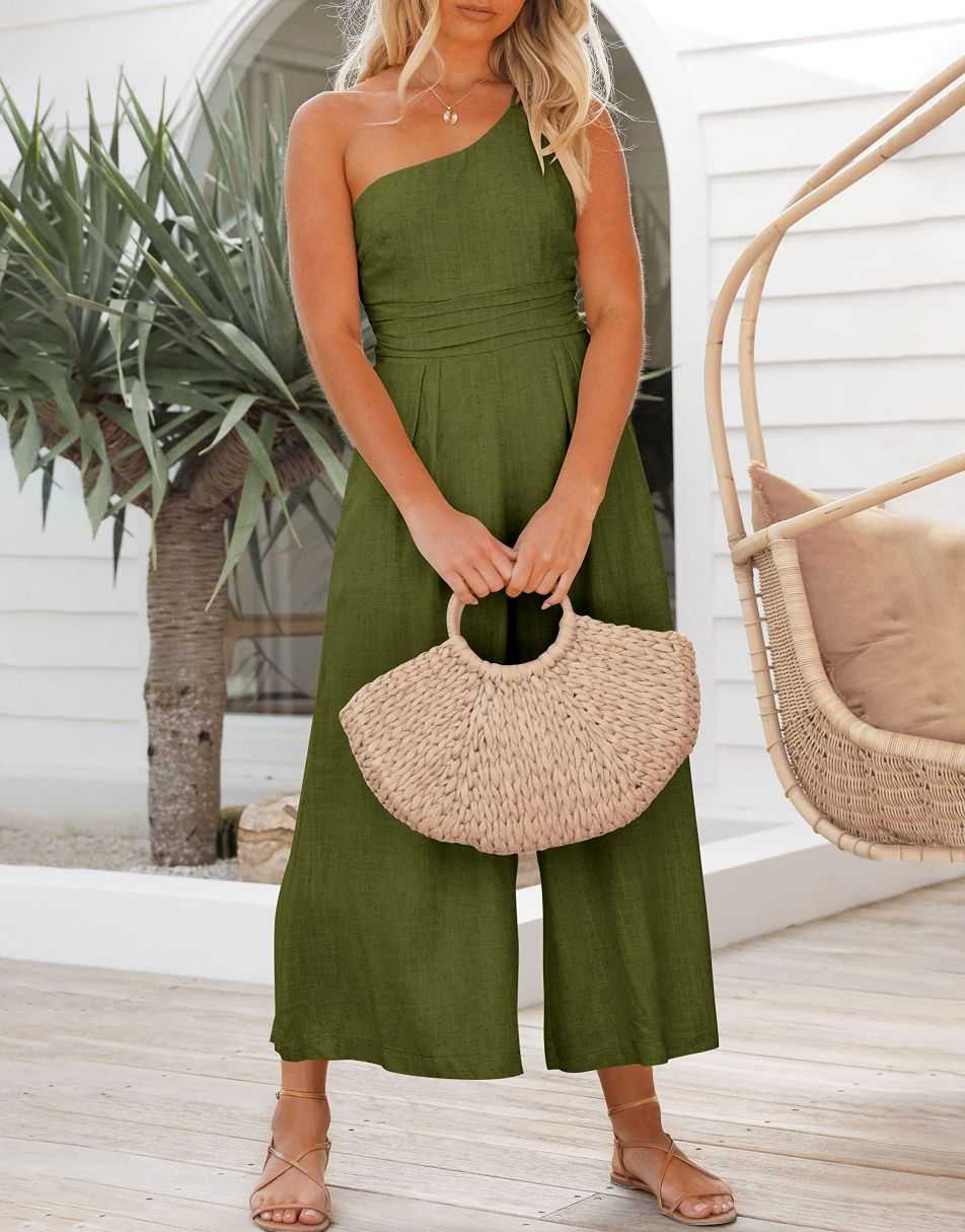ANRABESS One Shoulder High Waist Wide Leg Linen Jumpsuit