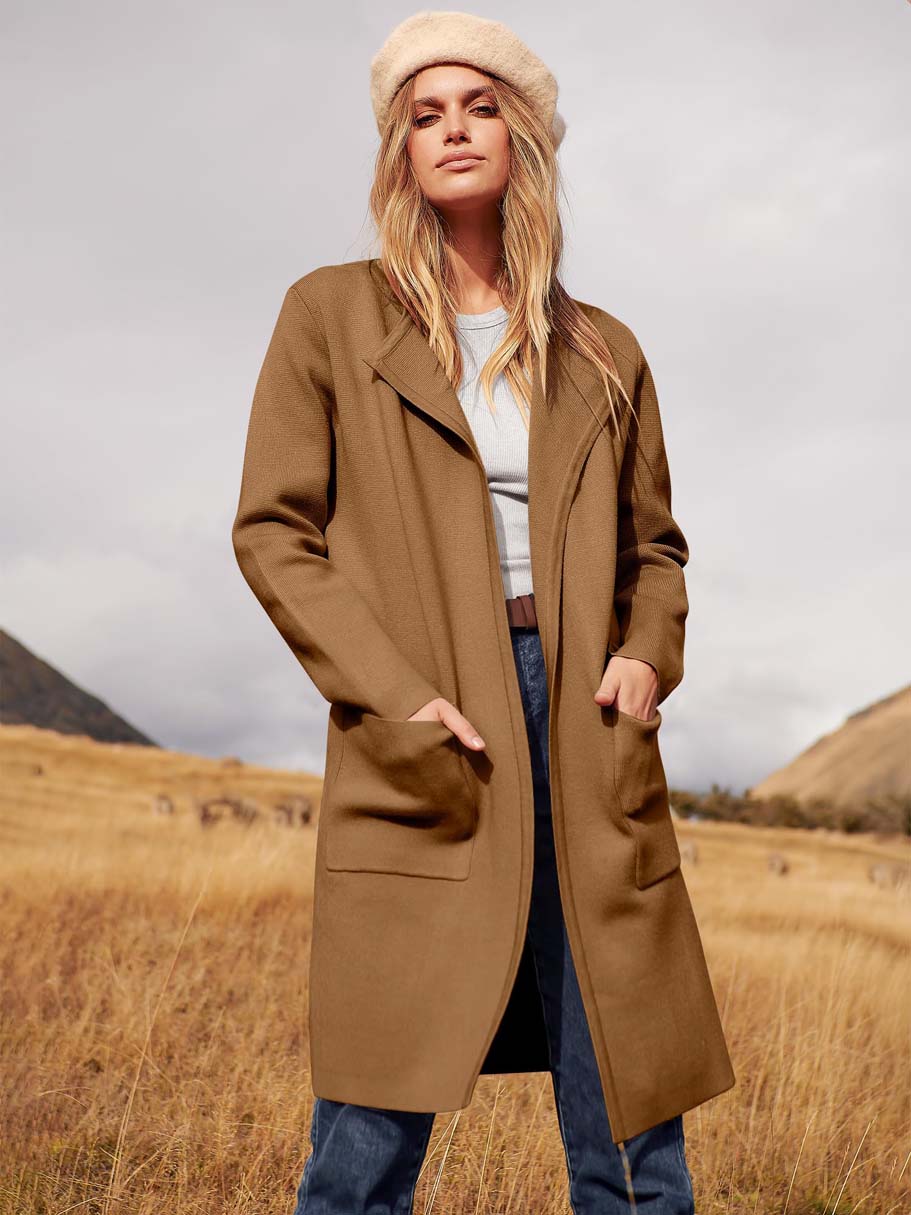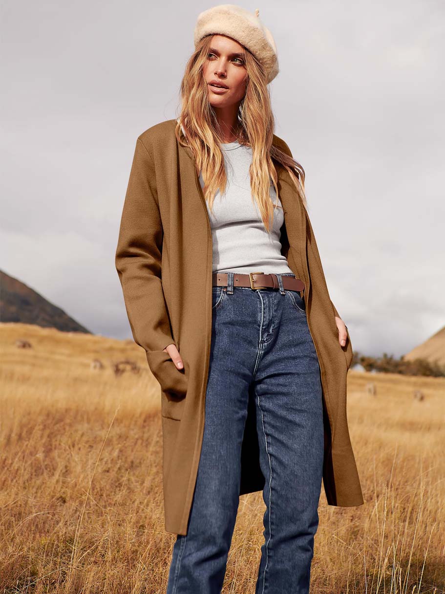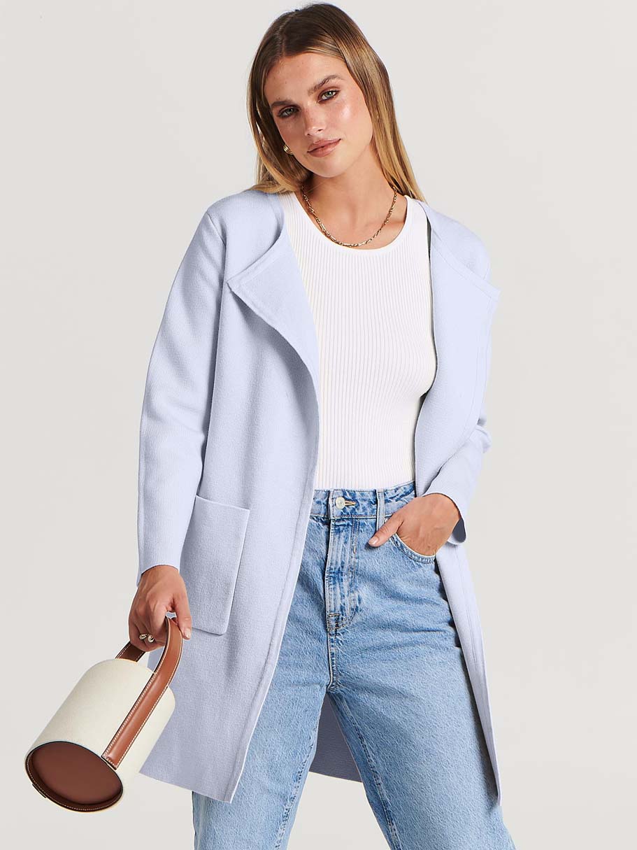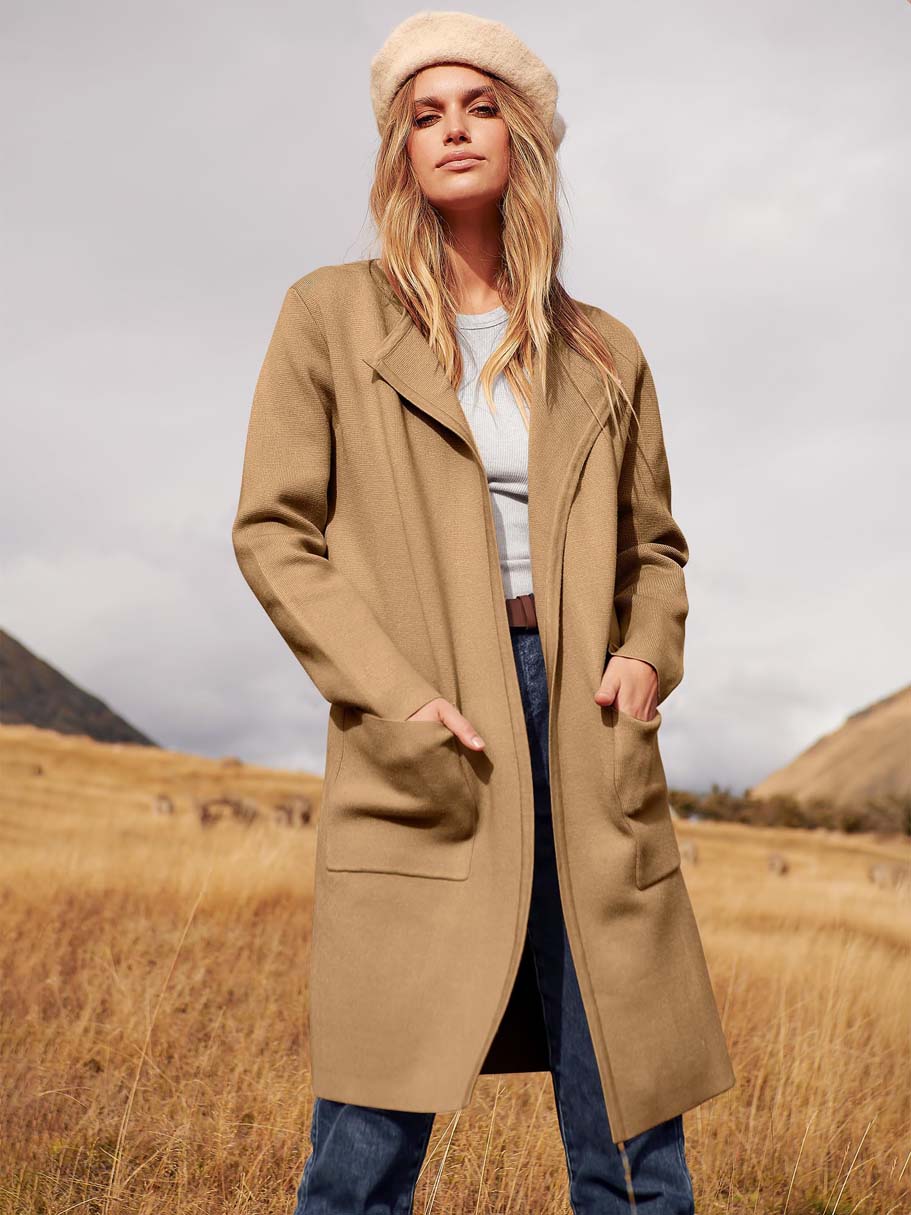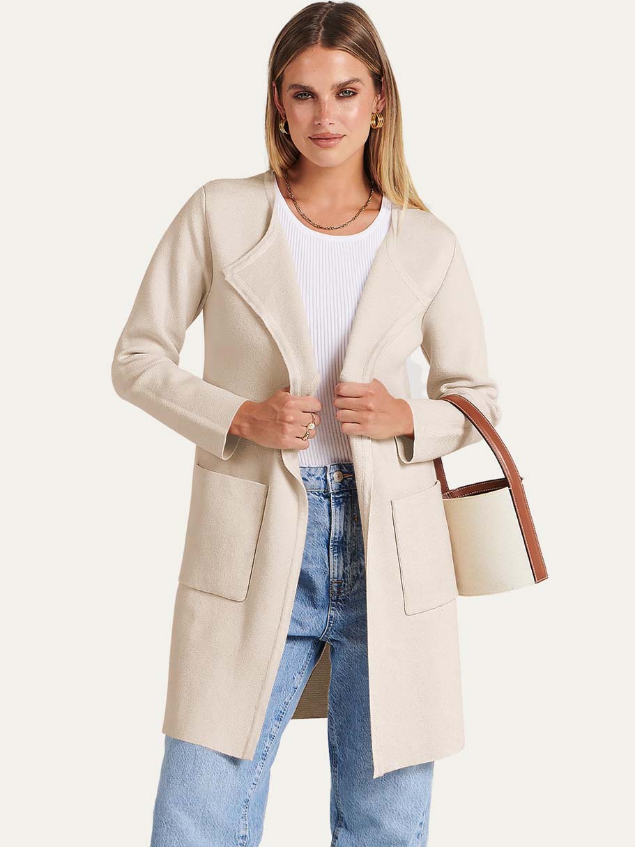 • Features - Open front, With Pockets. Lapel Neckline. Knit fabric provides flexibility. Not lined. Hand wash / Do Not Bleach / Dry Flat / Do not iron.