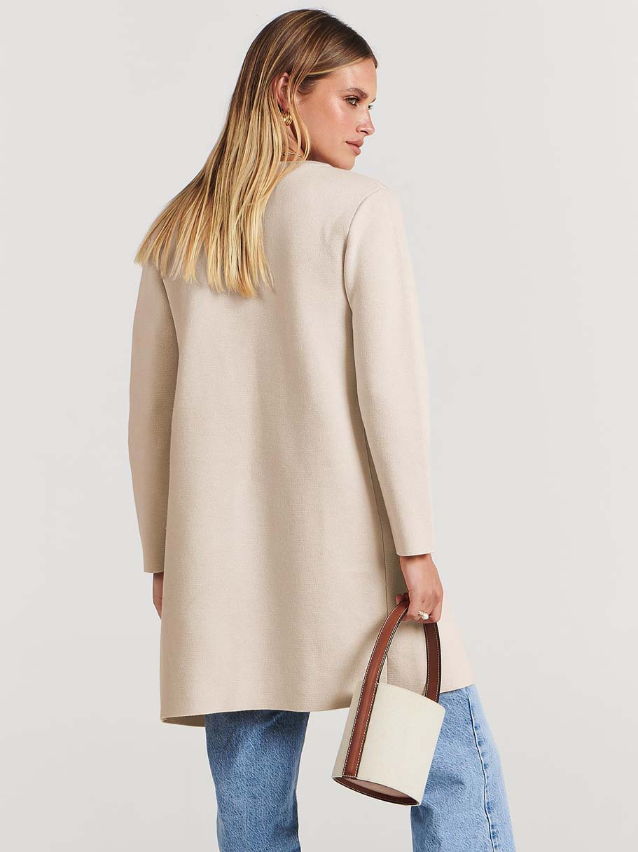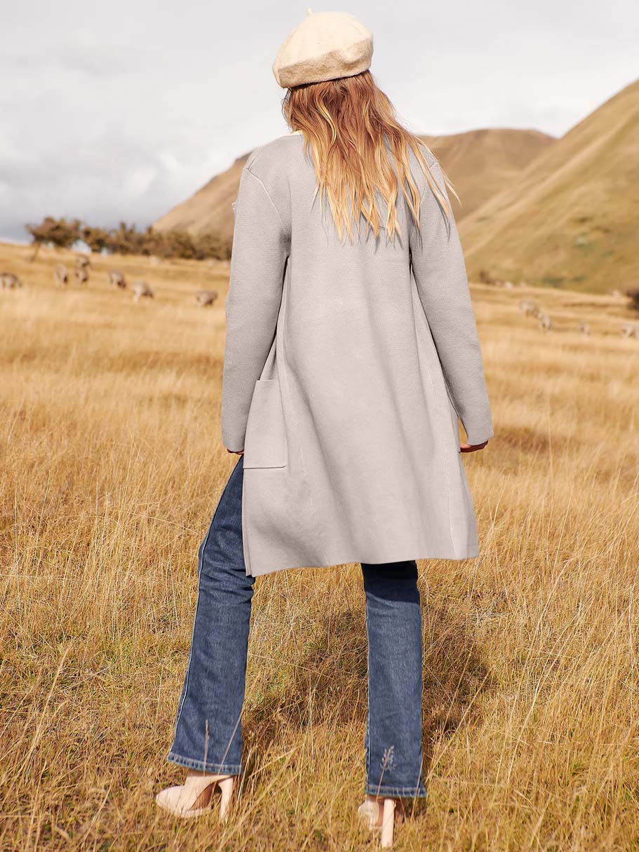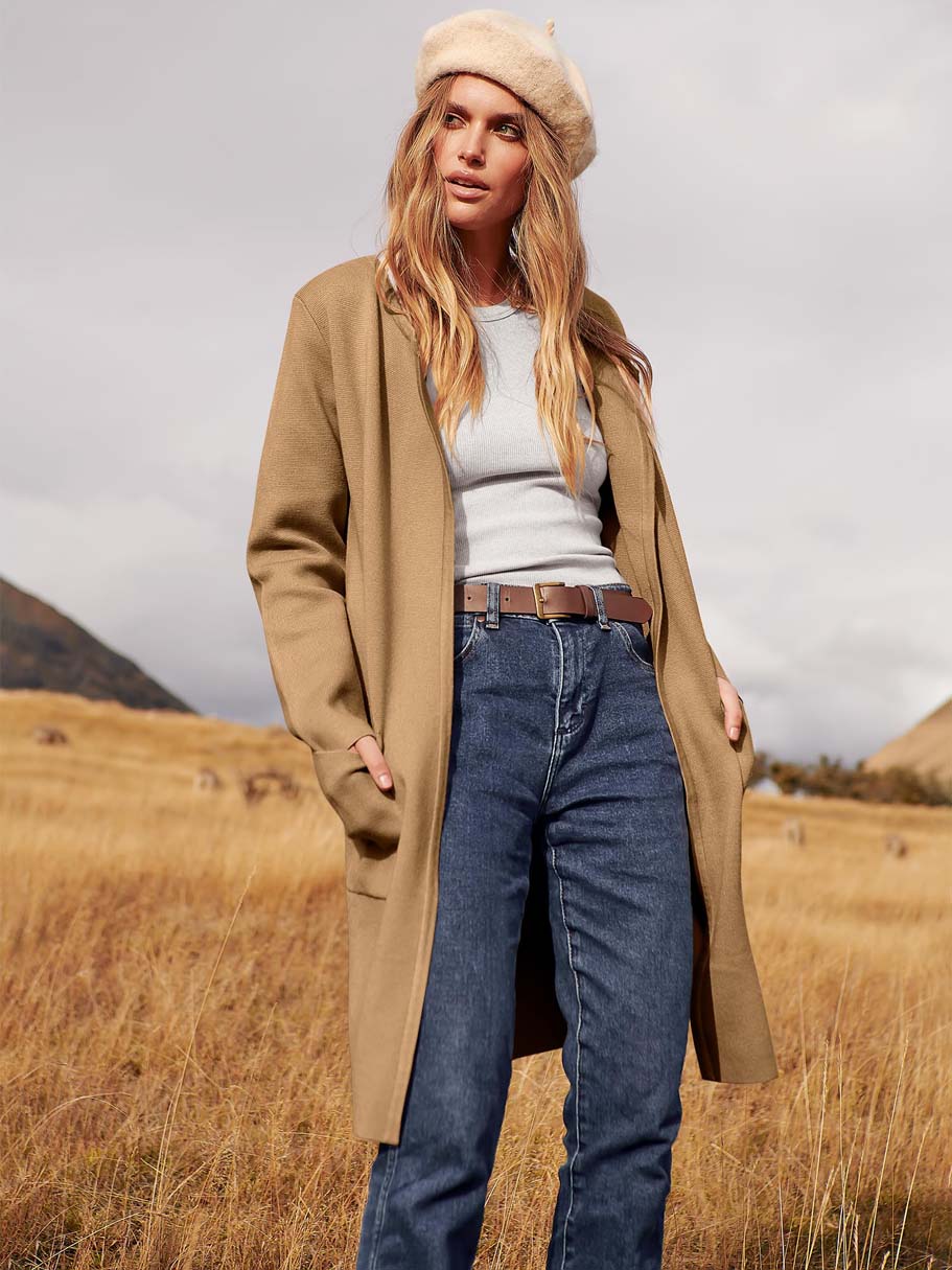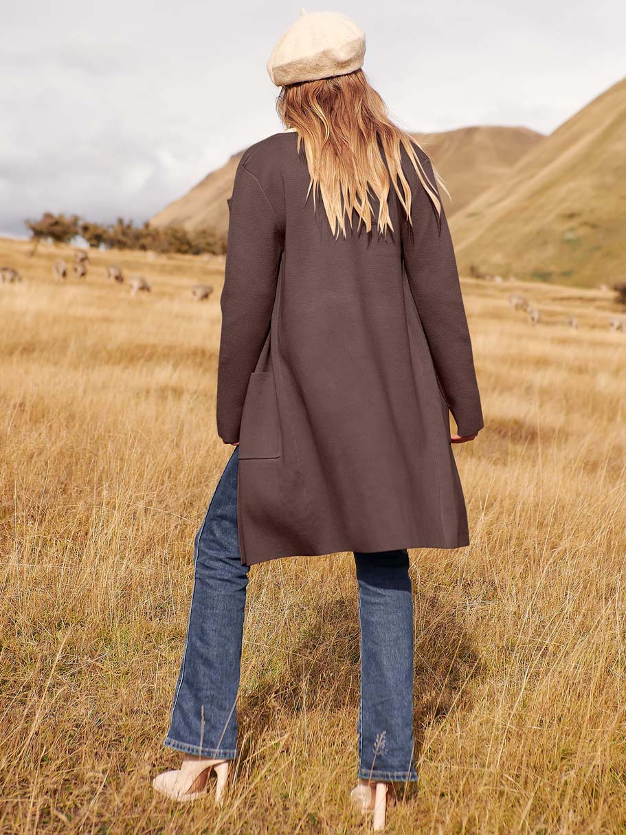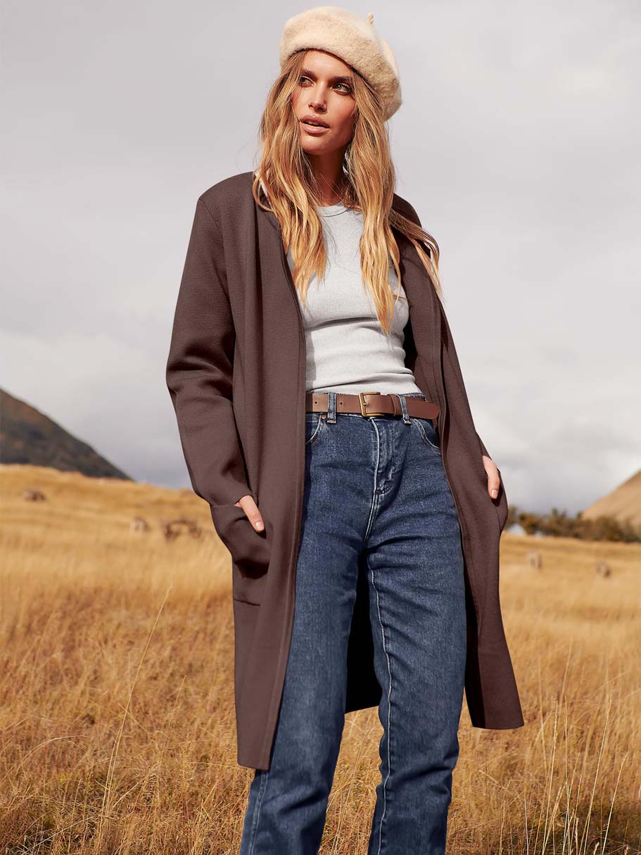 • Features - Open front, With Pockets. Lapel Neckline. Knit fabric provides flexibility. Not lined. Hand wash / Do Not Bleach / Dry Flat / Do not iron.