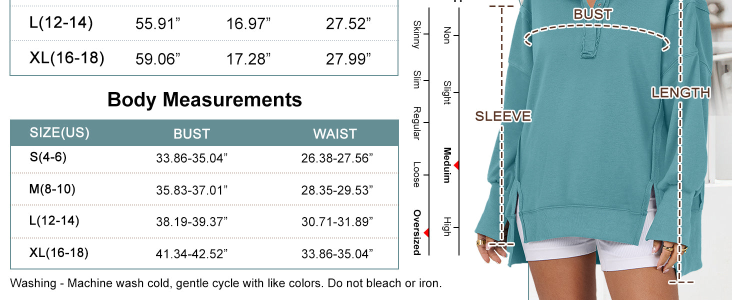 • Fit Type - Oversized. Size down if between Bust sizes.